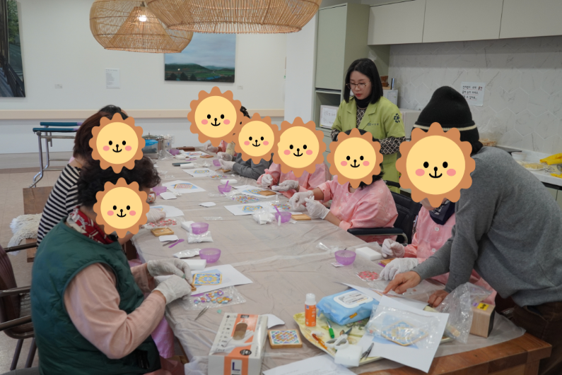 환우분들은 알록달록 다양한 모양의 타일에 관심을 가지며, 병실에 다시 안경을 가지러 가시거나, 다른 환우들께 재밌는 것을 한다며 불러 모으셨다. 긴 테이블에 환우들이 자리를 다 채운 만큼 설렘과 기대도 가득한 모습이다.