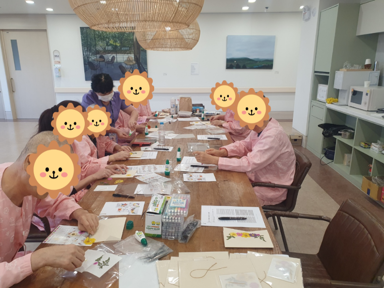 힐링 프로그램을 통해 시선을 환기할 수 있었으며 스트레스가 해소되는 시간이었다. 지난 21일(화)은 압화카드를 만들었다. 압화는 야생화의 꽃과 잎, 줄기를 채집하여 누르고 건조한 후 회화적인 느낌을 강조하여 구성한 것으로, 누구나 손쉽게 만들 수 있고 생화와는 또 다른 매력을 느낄 수 있었다.