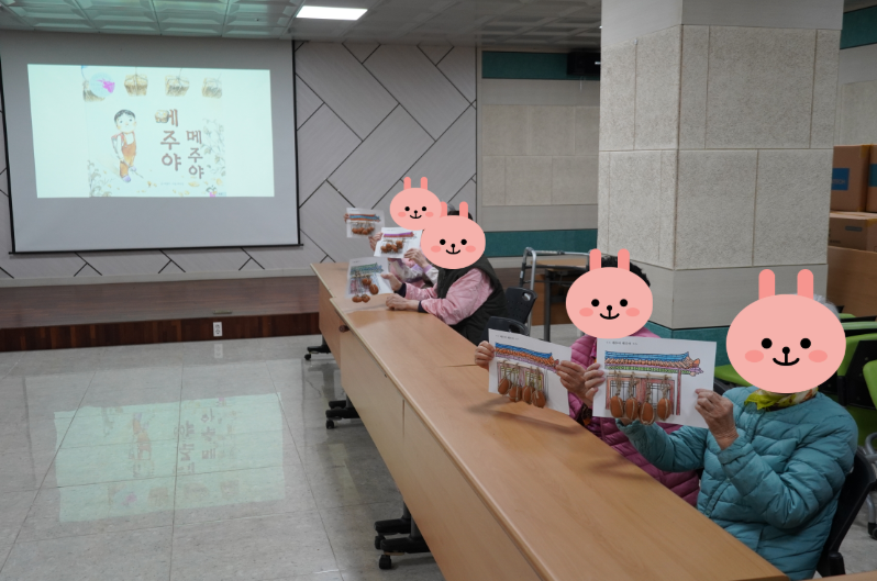 오늘은 ‘메주야’ 이야기를 들려주셨는데 강사님이 등장인물에 따라 목소리를 바꿔가며 읽어드리니 환우분들은 금세 빠져들어 이야기 꽃을 피우셨다. “나는 메주를 잘 만들었어! 콩을 삶아서 바로 먹으면 맛있지!”, “새아기 때 메주를 잘 만든다고 칭찬받았어”라며 옛 기억을 떠올리셨다. 동화구연 다음으로 클레이를 이용하여 메주를 만들어 보았다. 먼저 메주와 비슷한 색을 만들기 위해 색깔을 섞어서 조물조물 반죽했다. 그리고 클레이를 바닥에 두들기며 네모 모양으로 만들고 끈으로 엮으니 그럴싸한 메주가 되었다.
