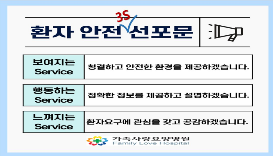환자의 건강과 안전은 가족사랑요양병원의 가장 소중한 가치이며, 직원들의 적극적인 노력과 환자 및 보호자분들의 참여를 통해 더욱 안전한 치료환경을 만들어갈 것이다.