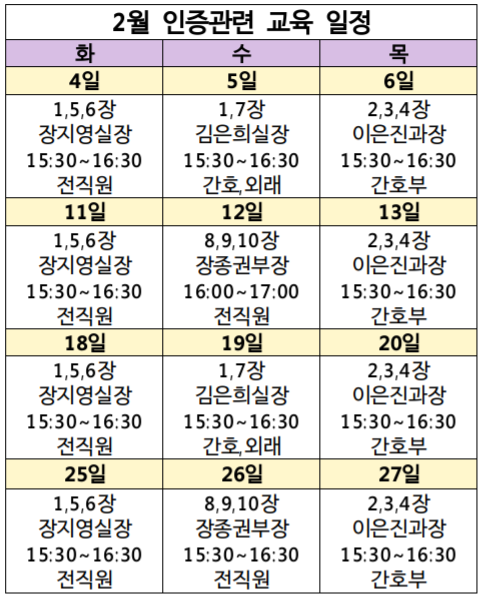 작년 12월부터 QPS실이 중심이 되어 진료부, 간호부,행정팀 등으로 인증 TF팀을 구성하였고, 요양병원 인증조사 표준지침서를 참고하여 각 부서별로 수차례 논의를 통하여 인증규정집을 마련하였으며, 직원교육을 통하여 이를 숙지 할 수 있도록 하였다. 이에, 남은 시간 동안 끊임없이 노력해서 최우수 인증기관으로 인증을 받을 수 있도록 최선을 다할 것이다.