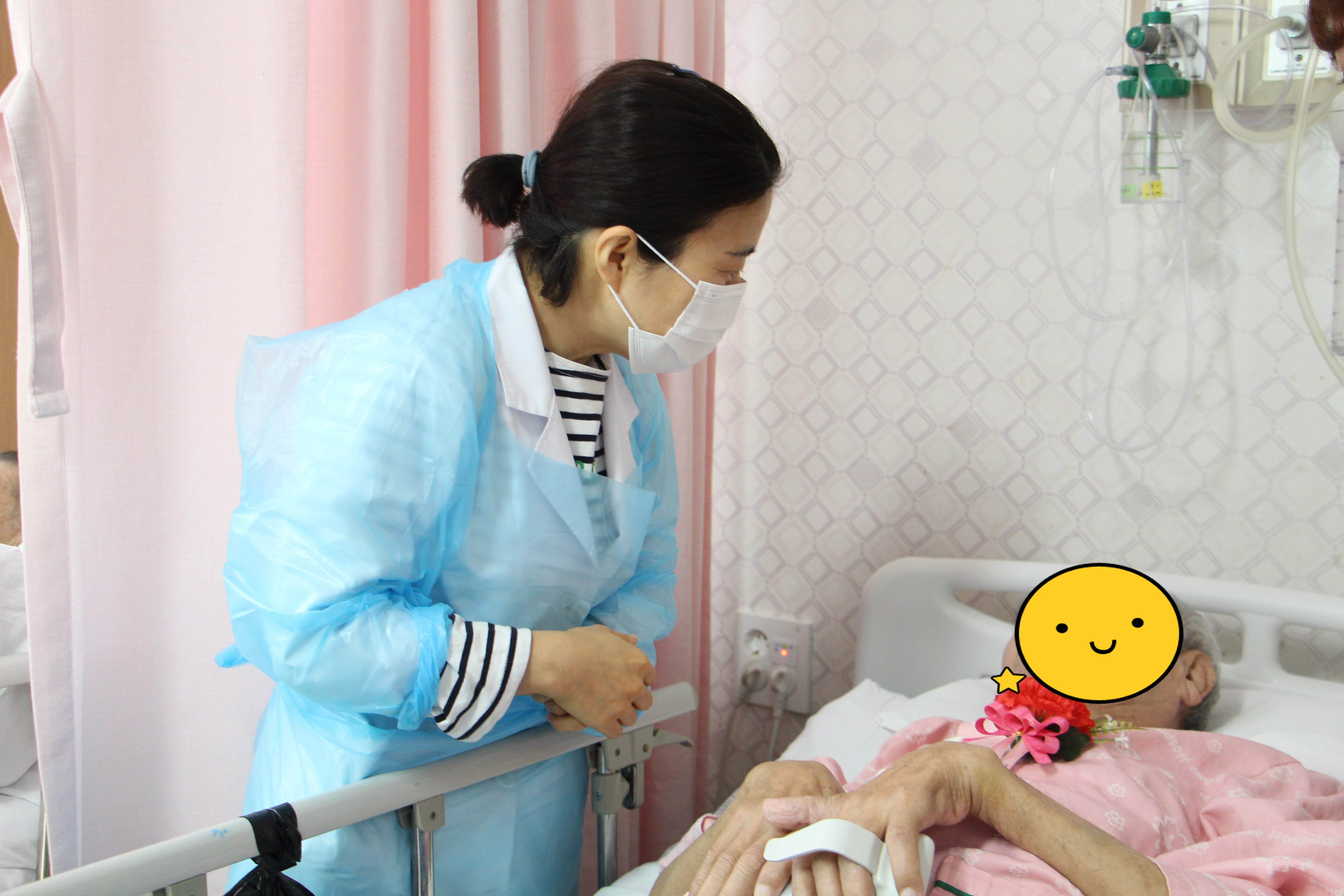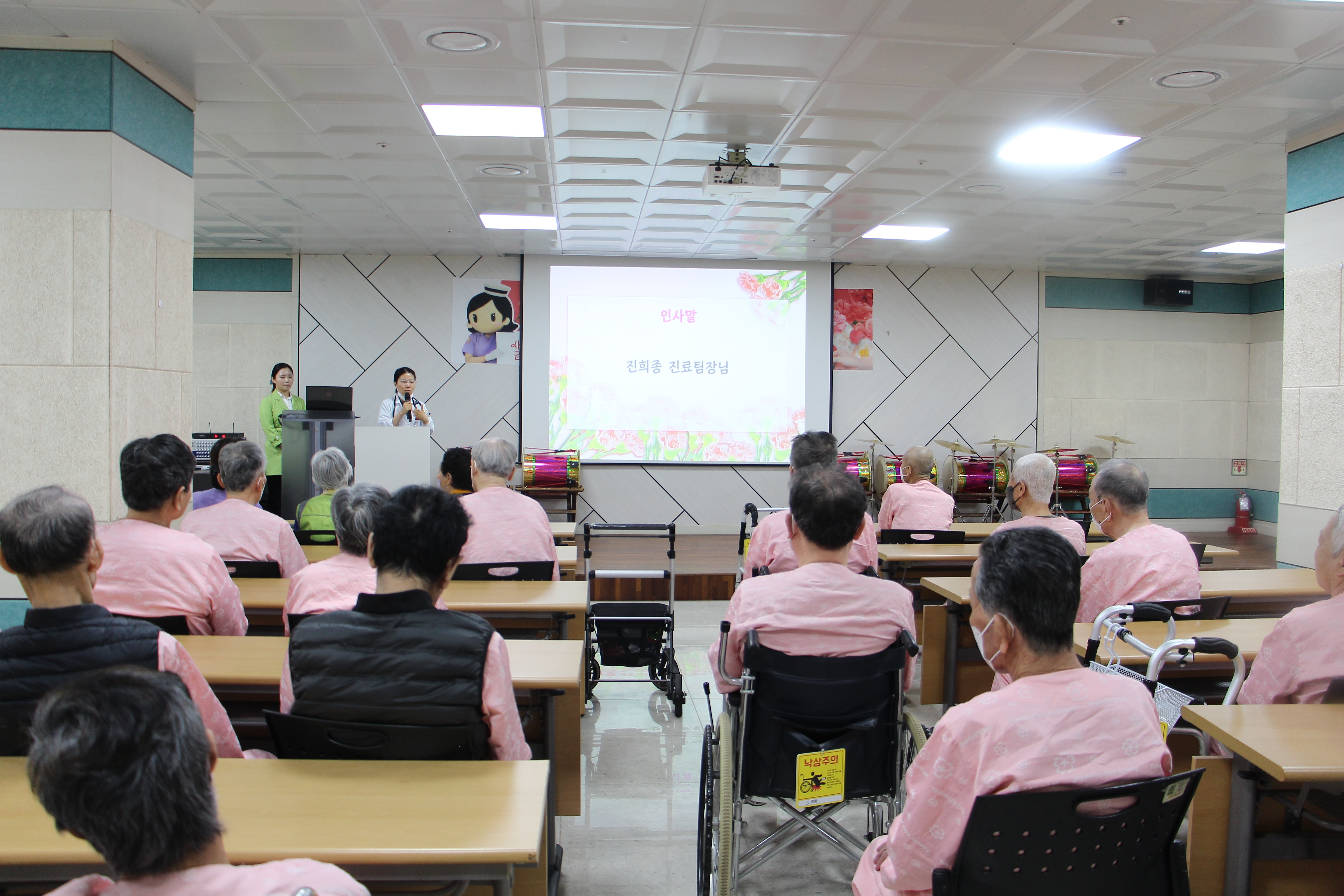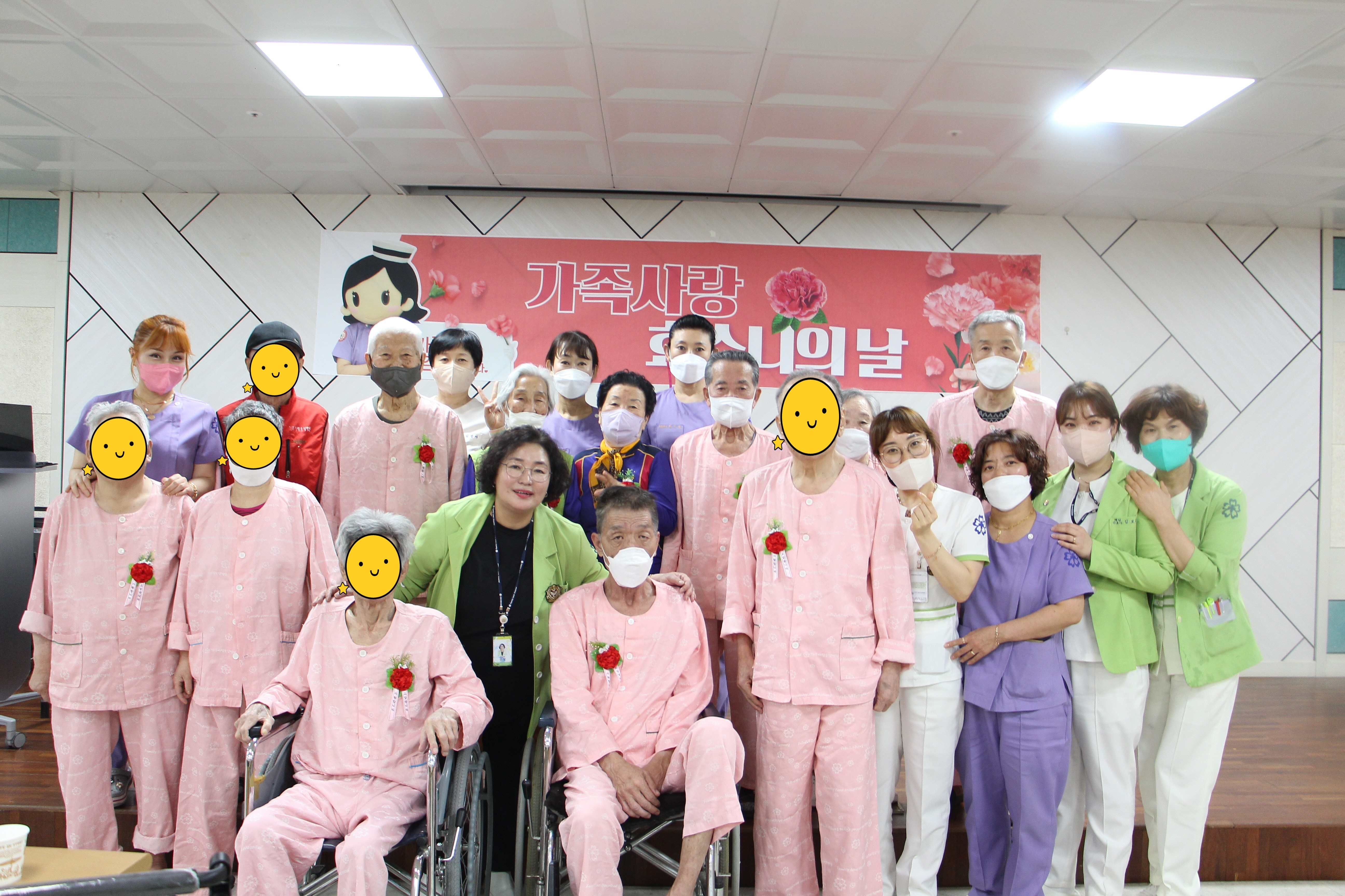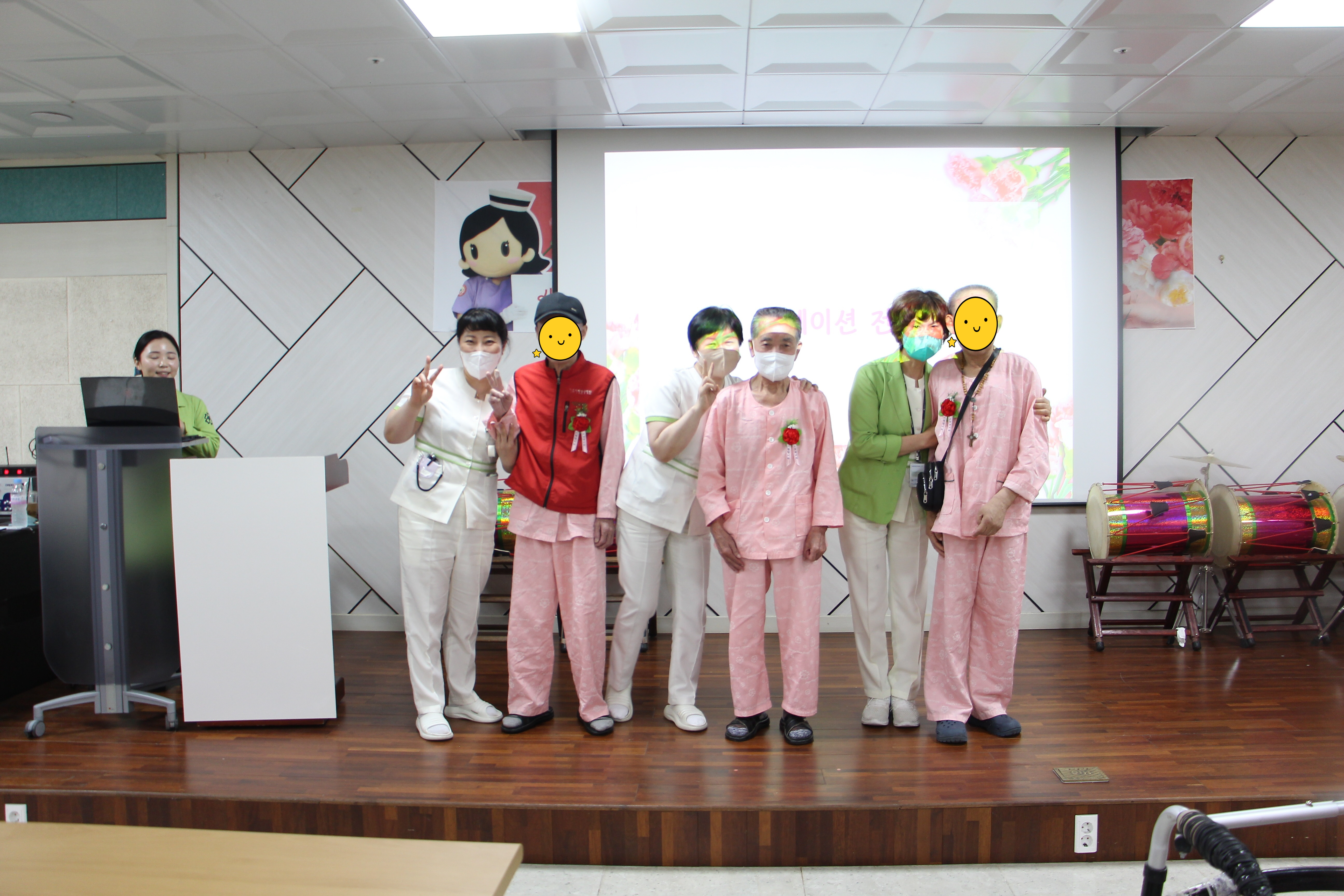 병동 주치의 선생님들이 카네이션을 달아드리니 부모님께서 웃음과 포옹으로 보답해주셨다. 또한 4월 28일(금) 곱게 한복을 차려입고 장수사진을 찍으신 분들에게 멋진 액자에 사진을 예쁘게 넣어 장수사진을 전달하였다.