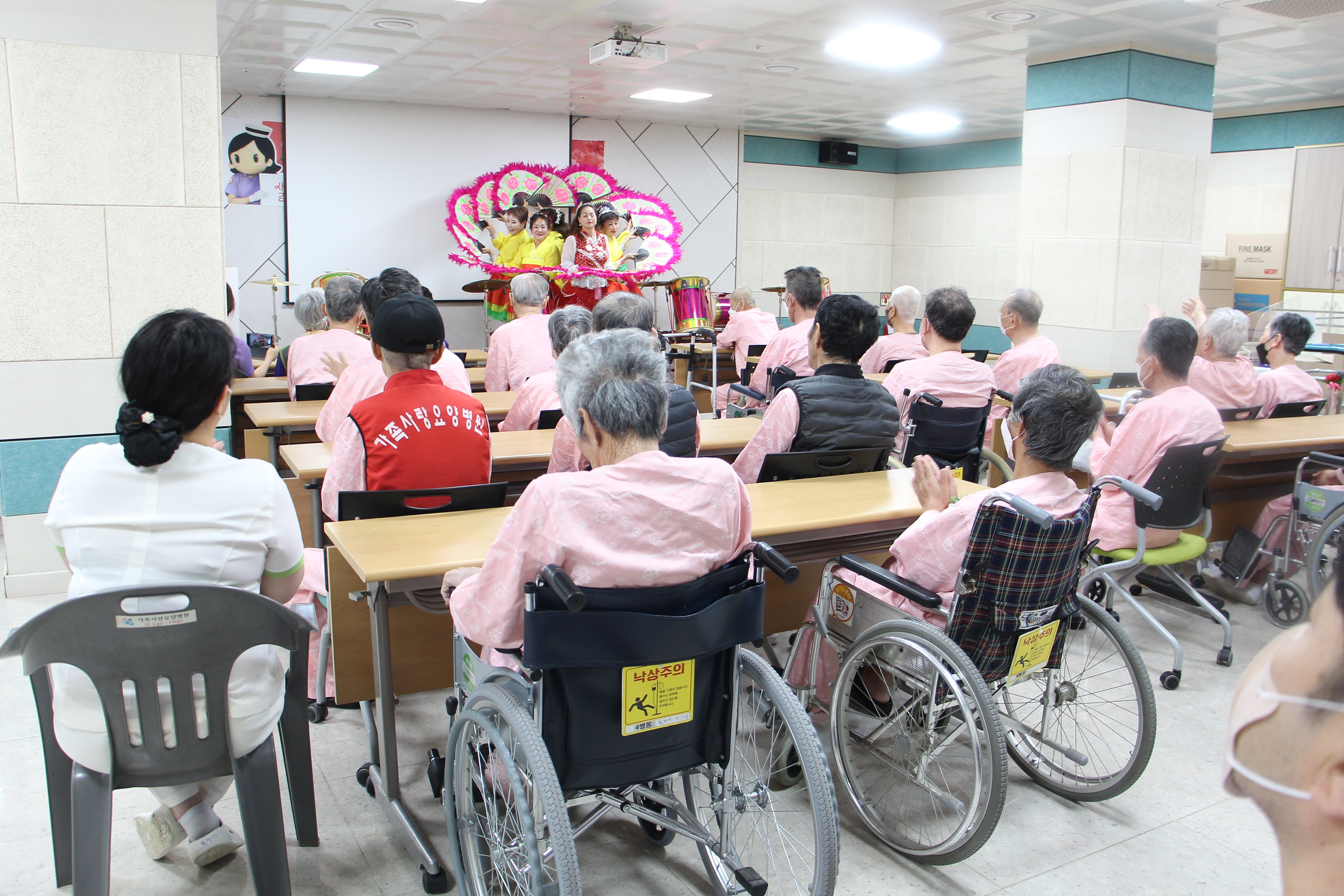 가족사랑은 아침부터 어버이 은혜 노래가 울려 퍼졌고, 9시 30분 부터 자주 면회를 오지 못하는 자녀를 대신하여 각 병동 주치의와 병동 선생님들이 한분 한분 찾아뵙고 가슴 한쪽에 카네이션을 달아 드리며 어버이 은혜에 감사를 전하였다.
