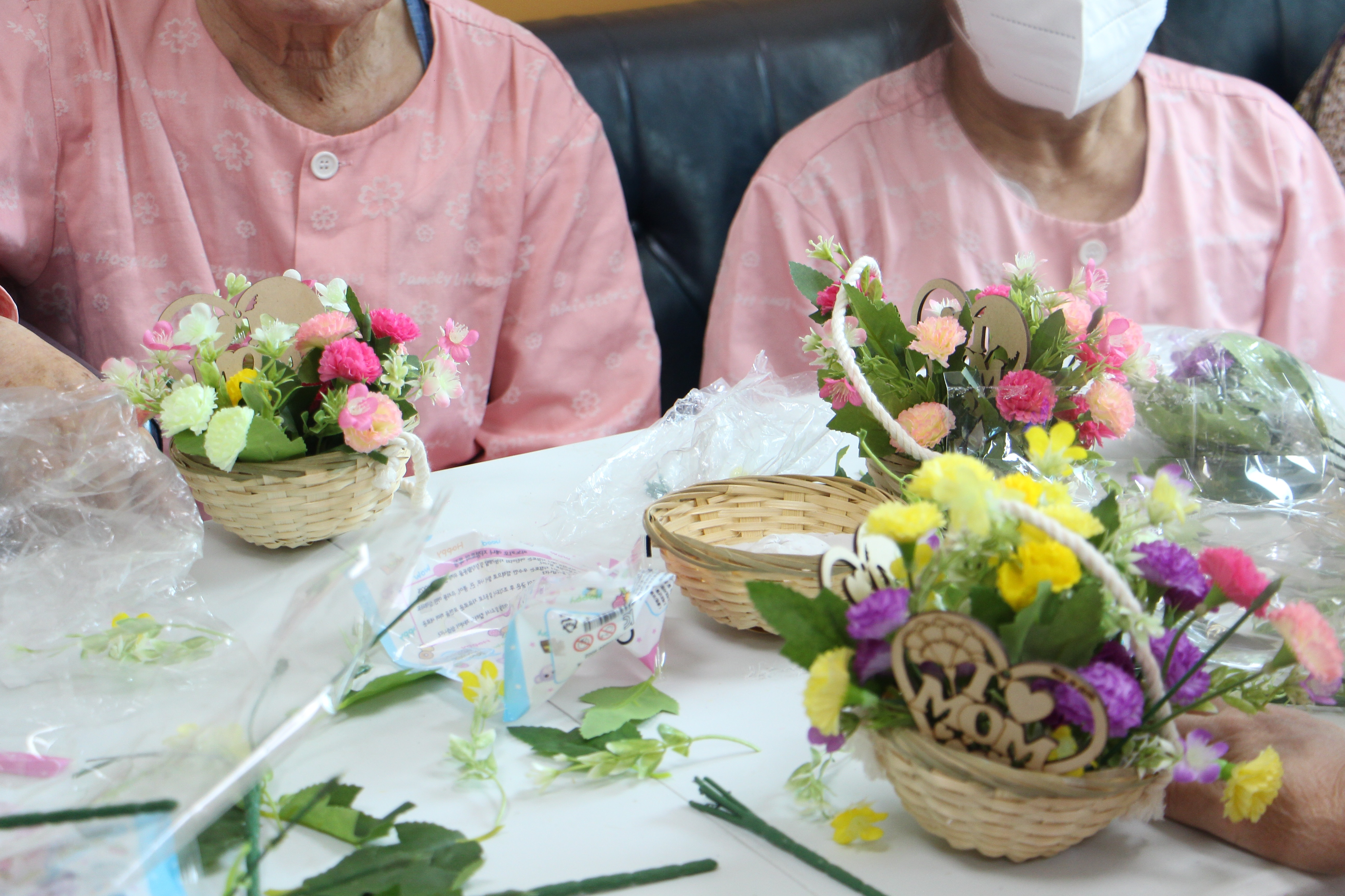 ‘아름다운 꽃바구니’ 지난 11일(목)에는 건강대학교 수업이 시작하기 전부터 오늘은 어떤 걸 만드는지 궁금해 하시며 병동 로비로 한 분 두 분씩 모이기 시작하였다. 꽃바구니를 만든다고 말씀드리니 관심을 가지고 수업에 참여하기 위해 모두 자리에 착석 해주셨다. 한 어머니는 처음 해보는 것이라 잘 할 수 있을지 싶다며 걱정의마음으로 시작하셨지만, 알록달록한 조화 꽃을 보시고 더욱 흥미를 가지고 예쁘게 만드셨다. 모두가 꽃바구니에 지점토로 흙처럼 바닥을 깔고, 원하는 색의 꽃을 선택하여 꽃바구니를 만들기 시작하였다. 서로가 서로의 완성된 작품을 보고 칭찬도 하고, 한 어머니는 아들이 면회 올 때 엄마가 처음으로 꽃꽂이도 해봤다고 자랑하고 싶다며 기대에 부푼 모습도 볼 수 있었다.