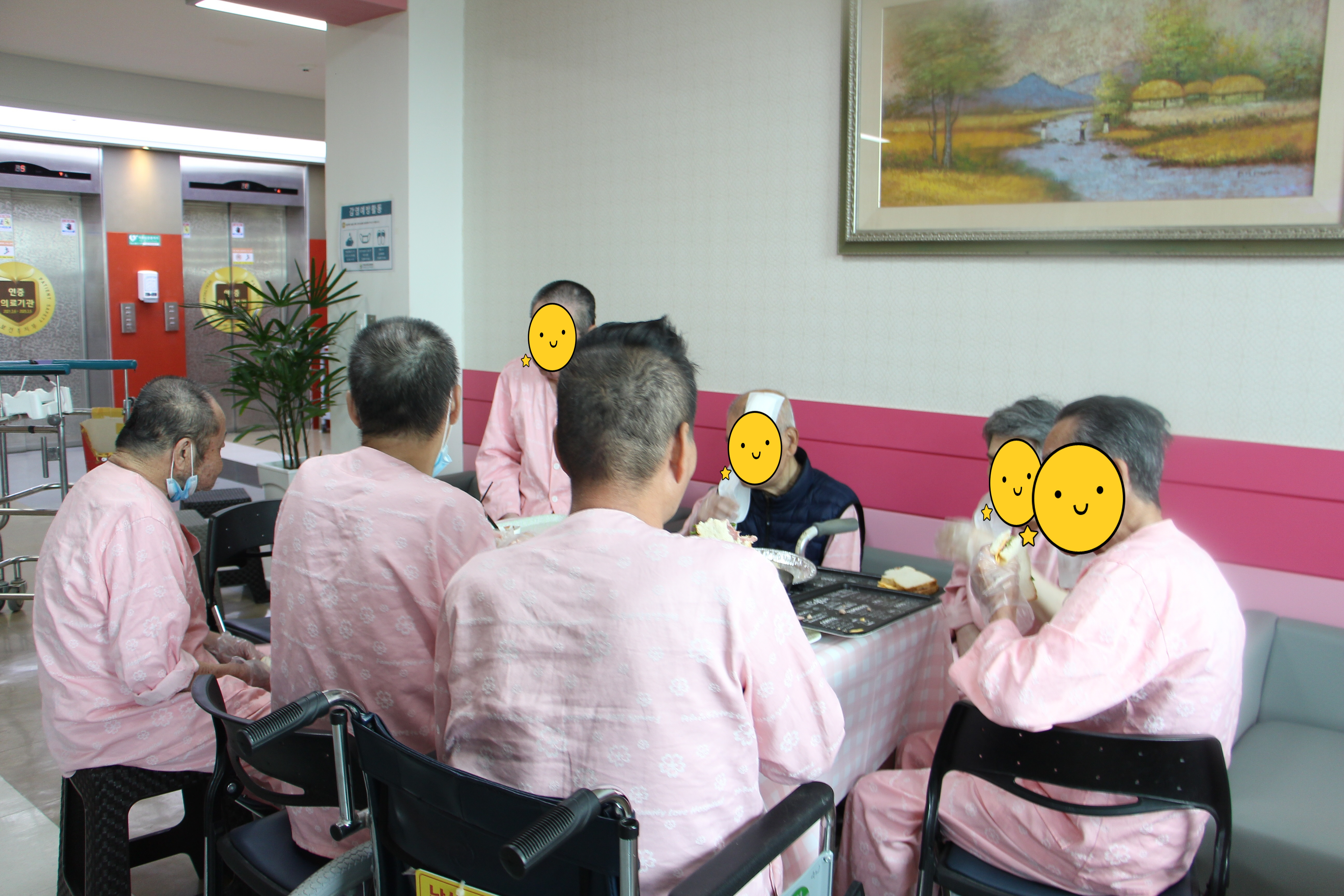 마지막으로 김밥, 떡, 과일 등의 먹거리를 나눠 먹었으며, 다 같이 단체사진 촬영을 했다. 효수니의 날 행사를 마치고 병동으로 올라가는 부모님들은 오늘의 즐거움을 엄지손가락으로 대신 표현해주셨다. 이번 효수니의 날은 함께 하는 모두가 어버이 은혜에 감사할 수 있는 뜻깊은 시간이였고, 부모님에게도행복한 시간이 되었기를 바란다. |