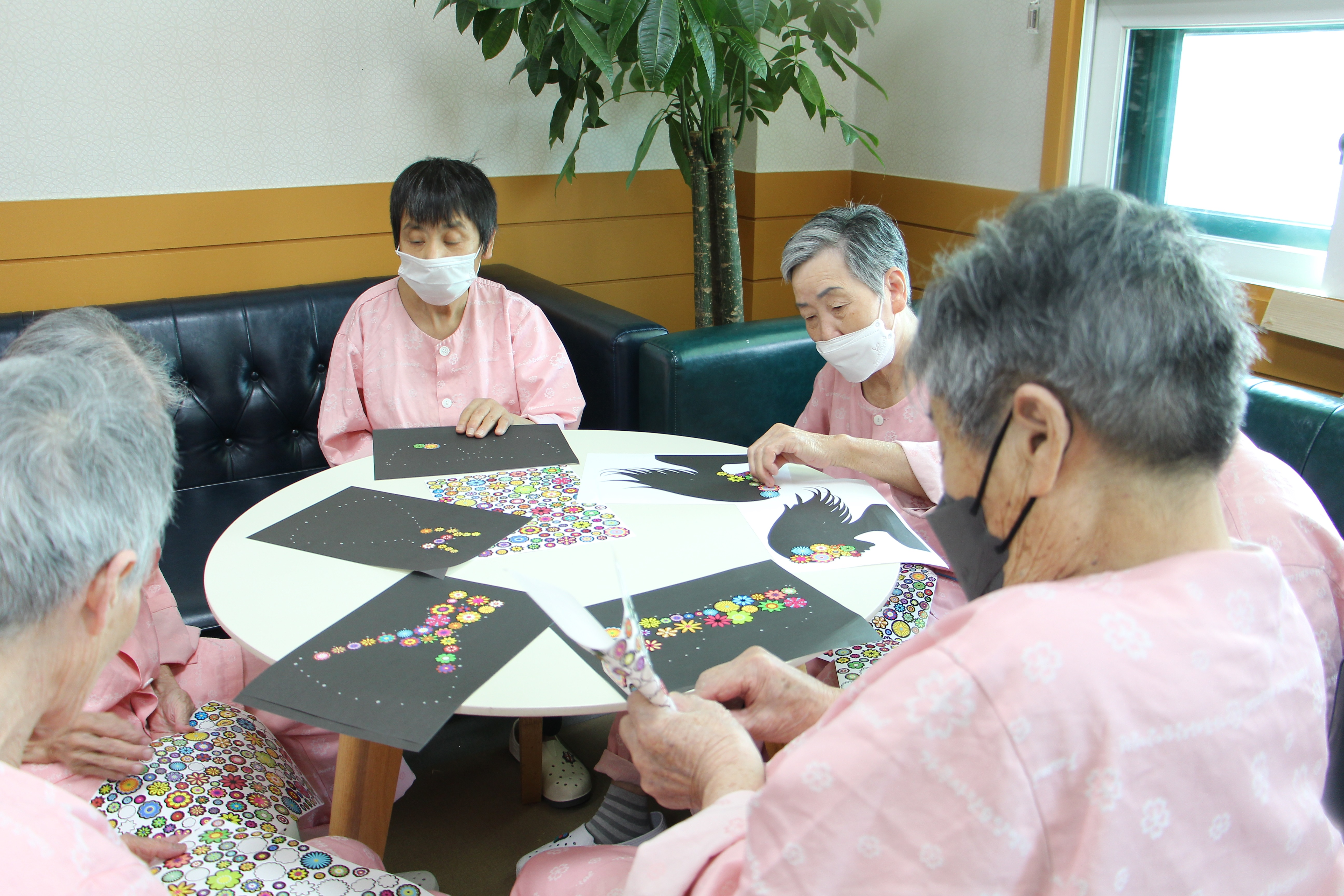 ‘스티커로 나만의 작품을! ’지난 19일(금)에는 예쁜 스티커로 작품을 만들어보는 수업을 준비하였다.스티커로 하는 활동이 손쉽게 할 수 있는 것이긴 하지만, 생각하면서 모양을 내야 하는 것이다 보니 정성스럽게 붙여야 더 예쁜 작품이 완성된다. 우리 부모님들은 연하게 그려진 그림 도안에 스티커를 멋있게 채워가셨다. 직접 만든 작품을 보고 부모님들이 만족해하시며 옆에 있는 친구분에게 자랑하시기도 했다. 이번 건강대학교 수업은 손으로 스티커를 떼고 붙이고를 반복하며 소근육을 발달시킬 수 있는 수업이었다.