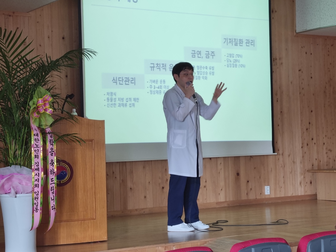어르신에게 실질적으로 도움이 될 수 있는 유익한 내용의 건강강좌를 진행하여 많은 분들이 참여해주셨다. 또한 어르신들을 대상으로 건강체크 봉사활동을 진행하였다. 3일(수) 신풍동행정복지센터, 4일(목) 김제노인종합복지관, 8일(월) 김제시청 실내 체육관, 19일(금) 대인노인회 김제지부에서 혈압과 당 체크를 도왔으며, 어르신들은 병원까지 가지 않고 함께 모여 건강체크를 할 수 있는 것에 크게 만족해하셨다.