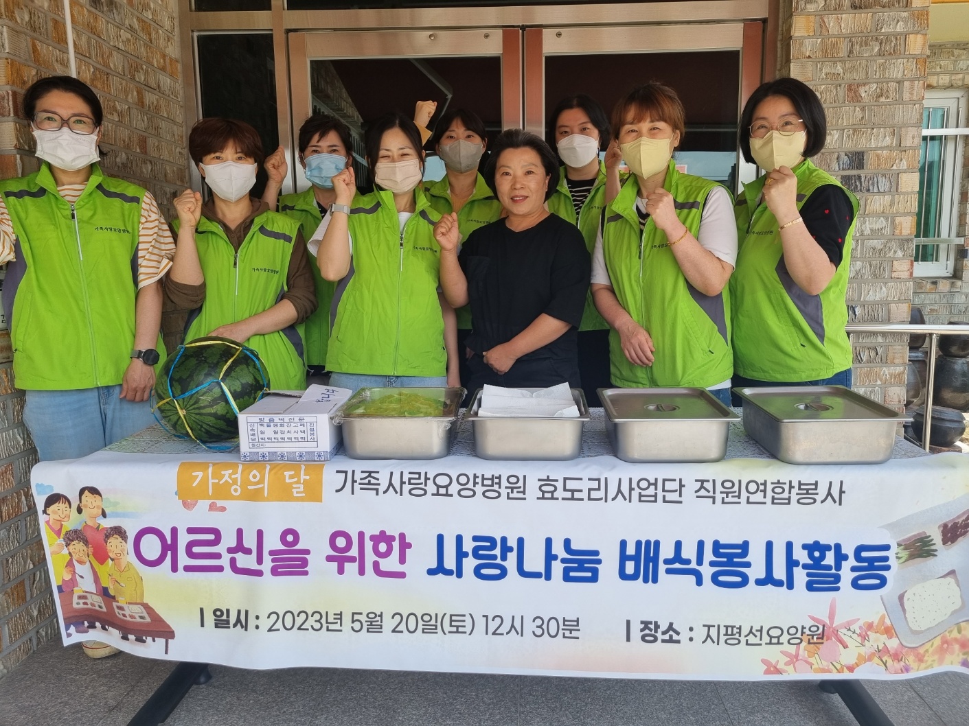 효도리사회사업단은 지난 20일(토) 12시 30분에 전북 김제시 진봉면에 위치한 지평선요양원에 방문하여 김제시 어르신들의 장기요양 및 돌봄으로 수고하시는 종사자 및 관계자분들을 격려하고 어버이날을 기념하기 위해 입소 어르신들을 위해 점심에 직접 준비한 맛있는 음식과 함께 배식과 반찬나눔 봉사활동을 진행하였다.