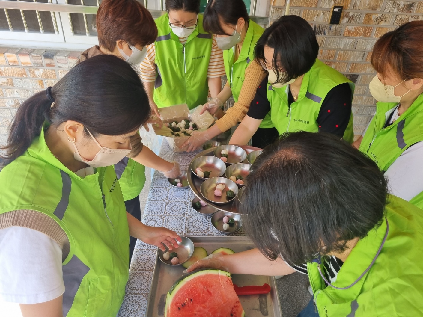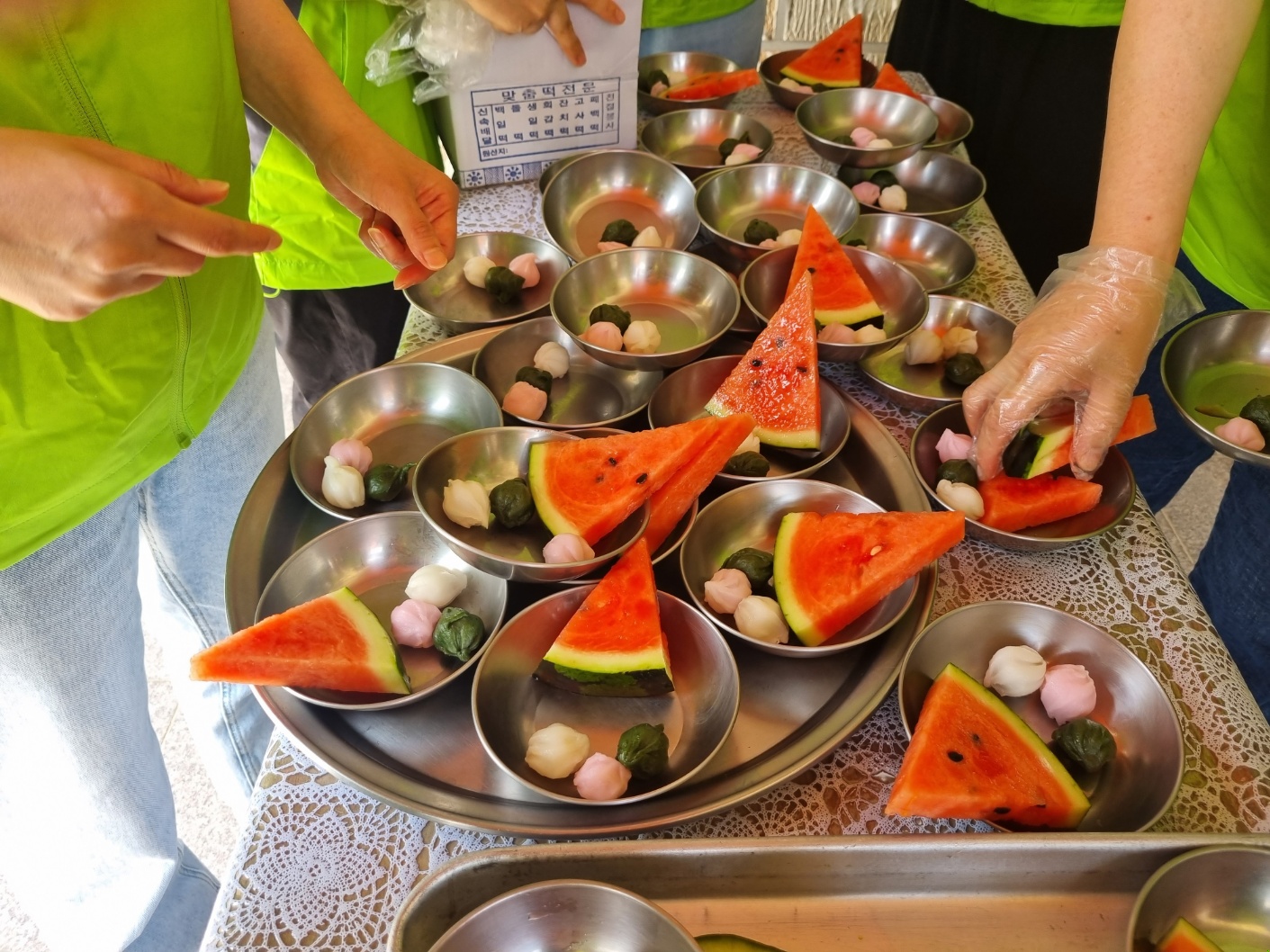 토요일임에도 불구하고 봉사활동을 하기 위해 9명의 직원들이 참여하였고, 필요한 반찬은 카라반파크아마존 조리팀의 도움을 받아 지원하였다. 식판에 밥과 국, 반찬들을 배분하고 어르신들이 앉아 드실 수 있도록 책상에 나열하여 혼자 드시기 어려운 어르신들은 직원들이 수발을 도와드렸다.