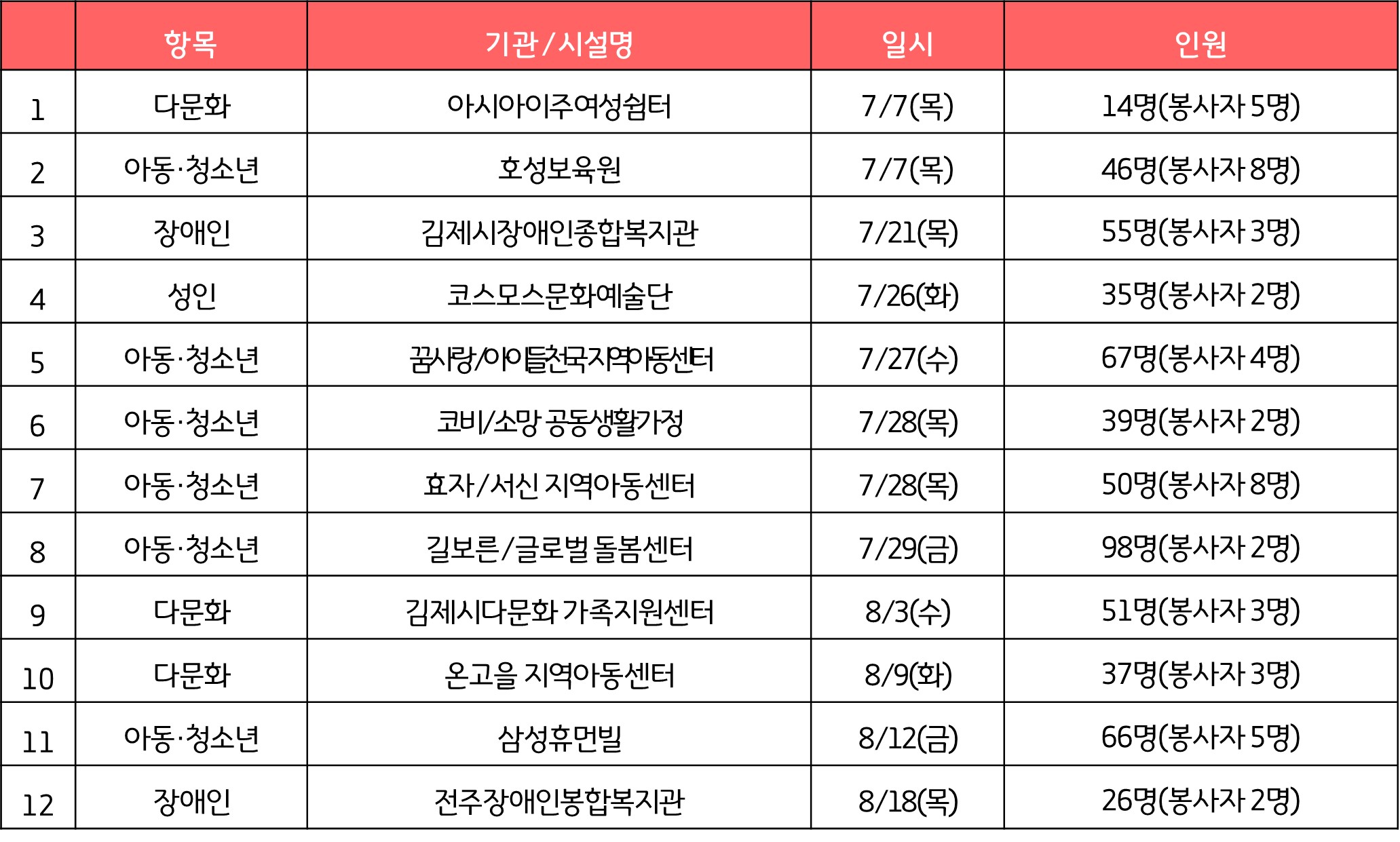 다문화 가정의 아이들과 아동, 청소년, 장애인 등 다양한 계층의 즐거운 물놀이를 위해 아마존의 카바나를 예약해 드리고 인원에 맞게 치킨과 피자를 지원한 이번 사업에서는 7월 7일 아시아이주여성쉼터를 시작으로 8월 18일 전주장애인종합복지관까지 두 달에 걸쳐 12개 기관, 총 534명의 인원이 참여하여 신나는 물놀이를 즐길 수 있었으며 총 10,264,000원의 지원금이 사용되었다. |